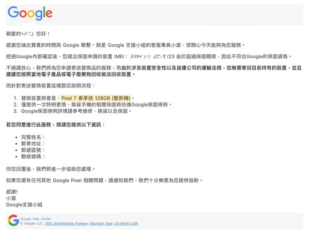 沒想到第一次的RMA就這麼好 Pixel 6 直接升級Pixel 7 舊機也不用寄回去 https://i.imgur.com/Nxmvt7K.jpeg