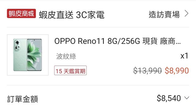 最近長輩一直抱怨 手機拍照成像效果不如朋友 查看近期中階機價格 RENO 11系列相當便宜 比較下來 鎖定RENO 11 8G/256G 全新空機價格8990元 蝦皮領折扣券購買8540元 https://i.imgur.com/UpRhctU.jpeg