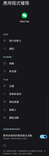 我因為 Garmin venue 3一直讀取不到LINE訊息,打電話進去客服問,也改善不了這問題, 解除綁定換另外一支三星NOTE 20也一樣沒顯示。 結果還是這邊的版友厲害,我看到文章回覆去Garmin connect 裡面找通知打開,花了點時 間找到,沒想到裡面所有應用程式都打開讀取,唯獨只有LINE被關掉。傻眼,解決後我想說 裡面之前有綁信用卡設定,只設定一半還沒有認證 這次我打算綁行動支付有優惠的信用卡,把先前的解除,解除兩三次才成功。後來我設定時 裡面有個選項可以使用 NFC 感應讀取卡號綁定 卡片一靠上去跳出來的 app 竟然是 we chat 且打開要讀取綁定的頁面,我傻眼直接關閉。 去裡面查,我只開兩個權限,沒想到手機還優先跳出we chat要讀取我信用卡... http://i.imgur.com/66W0D4P.jpg