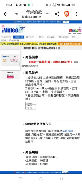一年合約 410/一個月 中華電信 4g不限速吃到飽!! 我應該會放棄無框門號(反正本來