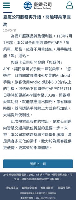 為提升服務品質及便利性,113年7月1日起, 本公司全面開通悠遊付APP「嗶乘車」服務, 旅客不用拿錢包,用手機就能「嗶」進站。    悠遊卡公司所開發的「悠遊付」APP,讓民眾 可以手機一嗶就乘車,「悠遊付」目前開放具 備NFC功能的Android手機,旅客使用Android 版本6.0 (含)以上的手機,可透過下載悠遊付 APP並於7月1日零時起更新APP版本至 3.0.98,開啟嗶乘車功能,就能感應進出閘 門,節省購票時間,並可透過手機線上方式進 行加值,大幅提升便利性。    此次嗶乘車服務的推出,是本公司邁向智慧交 通與數位轉型的重要一步。未來,本公司將透 過持續不斷優化服務,滿足乘客多元化的需 求,致力於為乘客提供更便捷、更高效的乘車 體驗。 臺鐵用嗶乘車搭車服務即將上線,目前僅限安 卓手機感應進站,以下開放iPhone 用戶崩潰, 抱怨可以但是不要怪悠遊卡公司,人家已經努 力打進臺鐵,希望蘋果公司能修改NFC的使用 範圍。 -- ※ 發信站: 批踢踢實業坊(www.ptt-site.org.tw), 來自: 223.136.203.159 (臺灣) ※ 文章網址: https://www.ptt-site.org.tw/MobileComm/M.1719462968.A.512