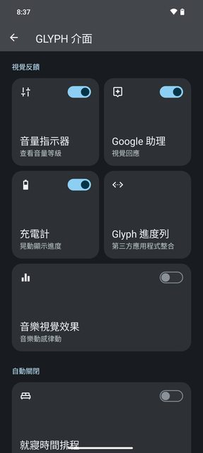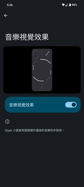 再下面還有一個音樂視覺效果,開啟後只要手機有發出聲音,背面燈條就會開始起舞,日常開啟還是有點困擾的,用一下就關掉了,而且開關常常會失效,想要秀給朋友看的時候卻亮不起來。