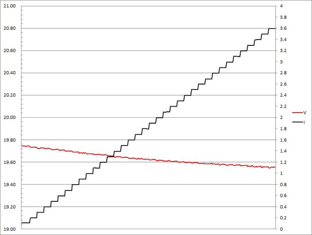 ▼C1搭配3A線材的固定檔20V輸出負載測試,電流增加時輸出電壓下降,電流超過3.6A截