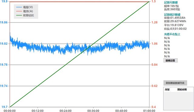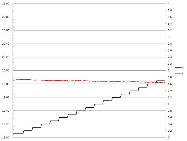 ▼充電器固定檔20V輸出負載測試,電流增加時輸出電壓下降,電流超過1.7A截止