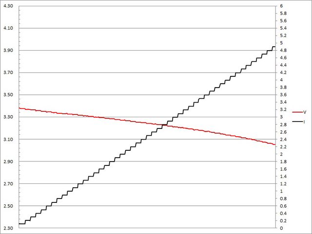 ▼充電器PPS檔3.3V輸出負載測試,電流增加時輸出電壓下降,電流超過4.9A截止
