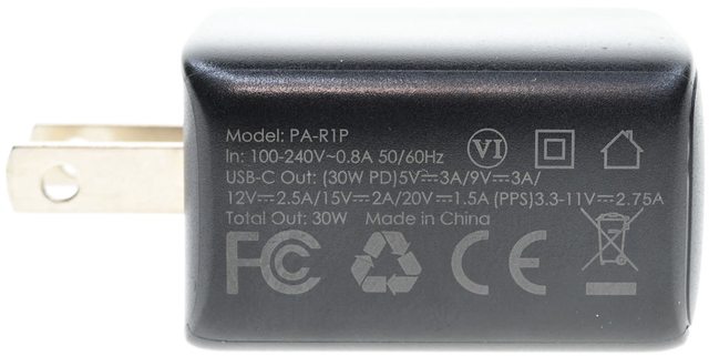 ▼30W PD充電器黑色外殼其中1個面積較小的側面印上型號、輸入/輸出規格、產地(中國)