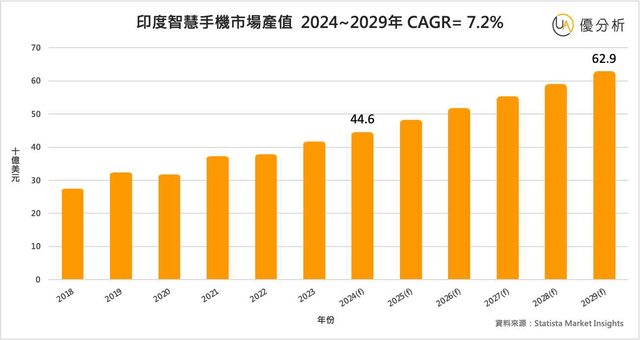根據 Statista Research 預估,印度的智慧型手機市場正在快速成長,預計2024年的收