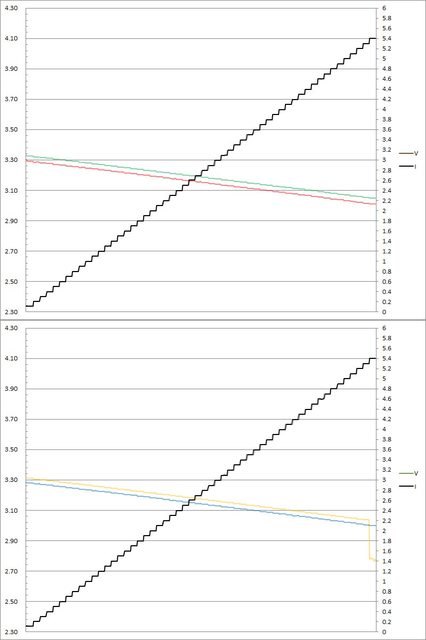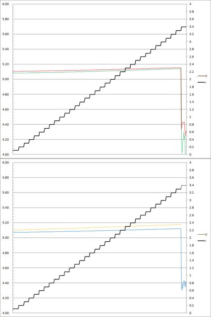 輸出電壓上升,輸出電流超過3.3A(C3)大幅壓降,超過3.4A(C3)/3.3A(C1/C2/C4)截止