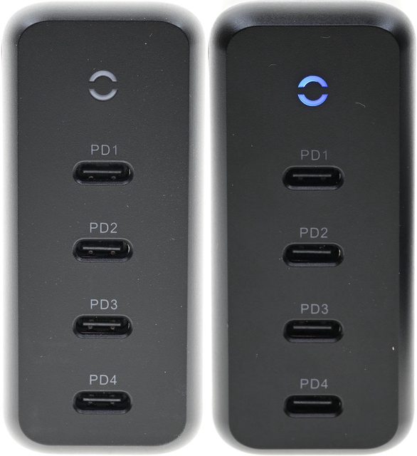 ▼黑色外殼其中一個較小的側面有指示燈及4個USB-C埠,輸出埠標示PD1(C1)、PD2(C2)、