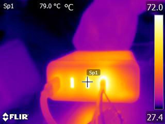 ▼USB-C1輸出100W,USB-C4輸出60W一小時後充電器的紅外線熱影像圖