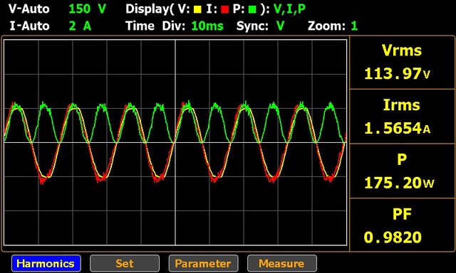 ▼USB-C1輸出100W,USB-C4輸出60W的輸入交流電壓/電流/功率波形如下圖所示,此時功