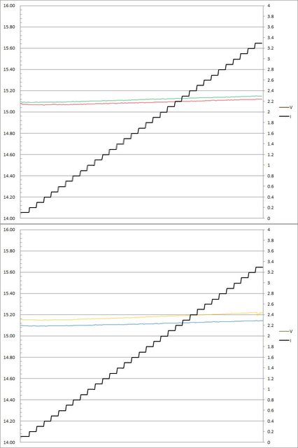 ▼C1(紅)/C2(綠)/C3(藍)/C4(黃)搭配5A線材的固定檔15V輸出負載測試,隨著電流增加,