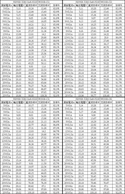 ▼C1/C2/C3/C4單獨使用下各組輸出轉換效率表,整體輸出轉換效率在81.8%至92.3%之間