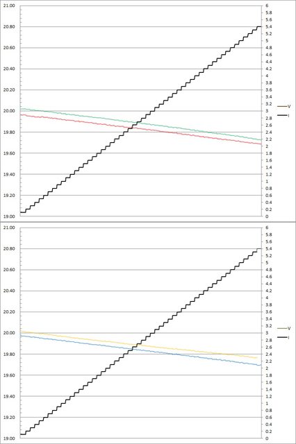▼C1(紅)/C2(綠)/C3(藍)/C4(黃)搭配5A線材的固定檔20V輸出負載測試,隨著電流增加,