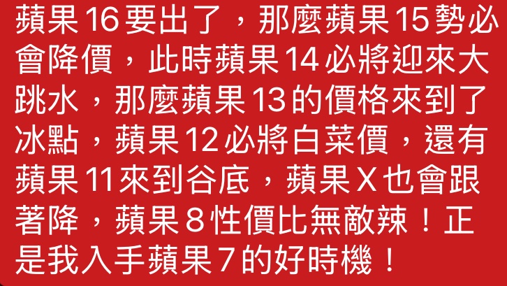 推 tommy123310 : iphone唯一要等的理由是等發薪水 不然售價/折舊都 09/22 17:03