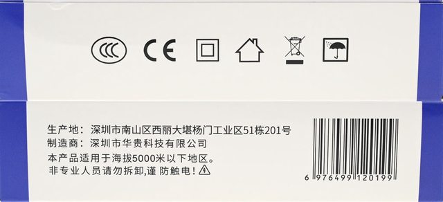 ▼外盒左/右側面有認證標誌、生產地/製造商資訊、注意事項、條碼