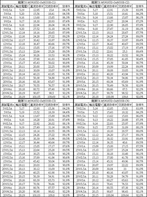 ▼PD1/PD2/PD3/PD4單獨使用下各組輸出轉換效率表,整體輸出轉換效率在83.9%至92.3%
