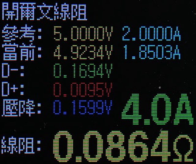 ▼PD1(紅)/PD2(綠)/PD3(藍)/PD4(黃)搭配5A線材的固定檔5V輸出負載測試,隨著電流增