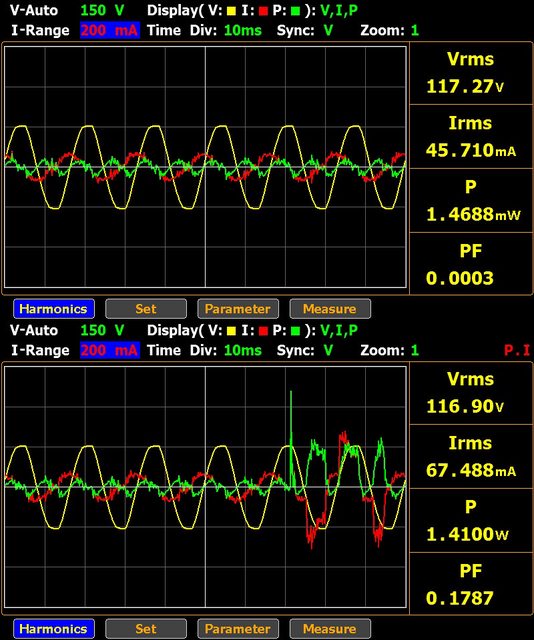 ▼接上電源,未接任何裝置下消耗功率最低1.46mW,最高1.41W