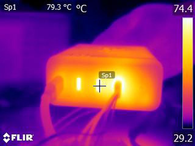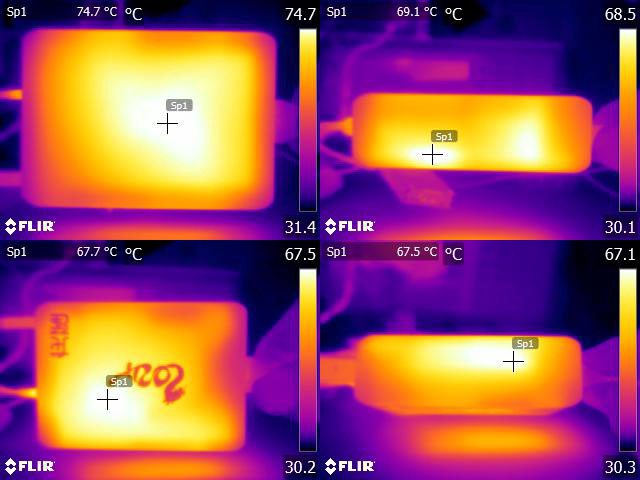 ▼PD1輸出100W,PD4輸出60W一小時後充電器的紅外線熱影像圖
