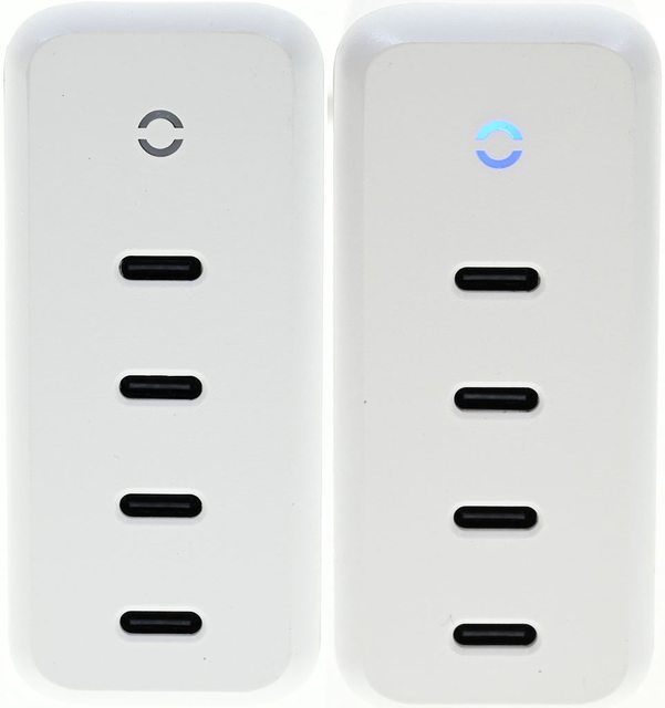 ▼白色外殼其中一個較小的側面有指示燈及4個USB-C埠,由上而下分別是