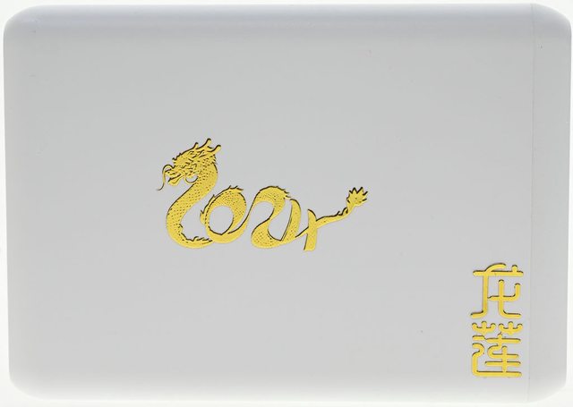 ▼白色外殼其中一個較大的側面有金色龍圖樣及龍蓮簡體文字
