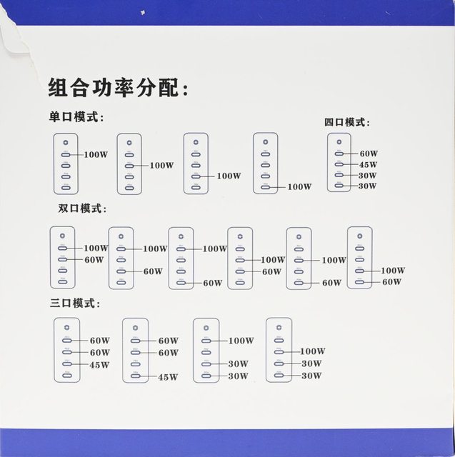接埠不同分配60W+60W+45W或100W+30W+30W,四埠使用時會分配60W+45W+30W+30W。插上/