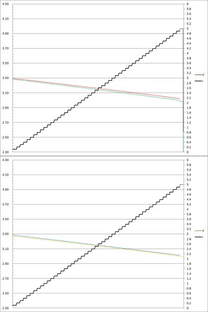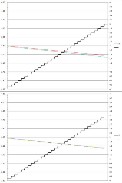 ▼PD1(紅)/PD2(綠)/PD3(藍)/PD4(黃)搭配5A線材的PPS檔3.3V輸出負載測試,隨著電流增
