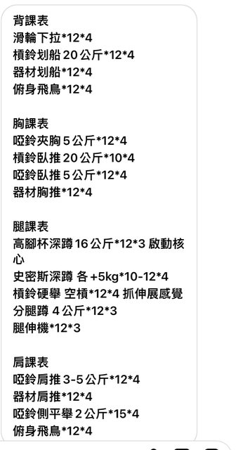 → creepy: 輕重量組數正常 每組次數也很平實 對真新手來說算不錯 11/29 02:16