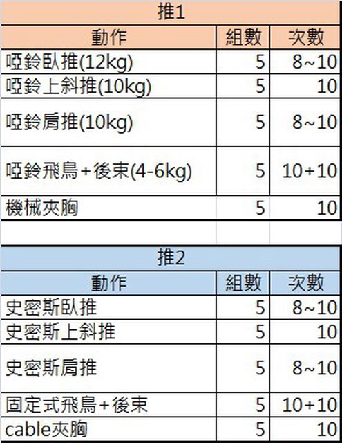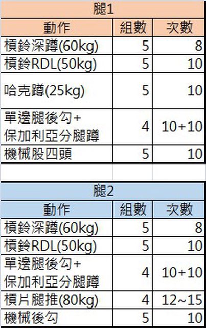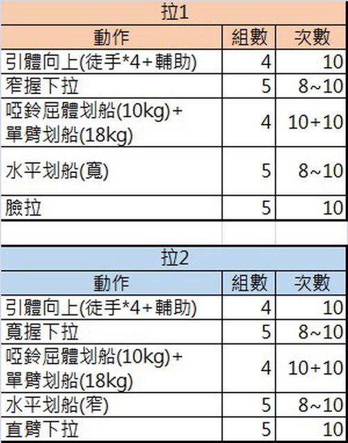 : 課表就換成背胸肩腿一周四練(每次1.5小時、腿2小時),