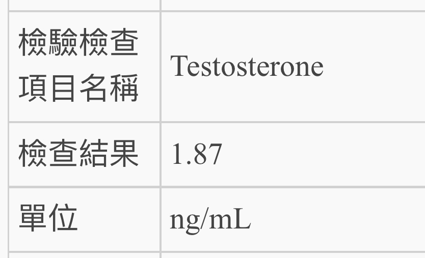 → wen12305: 樓上那個換算下來應該是187 ng/dl,比我高一點點但還是 03/20 15:04