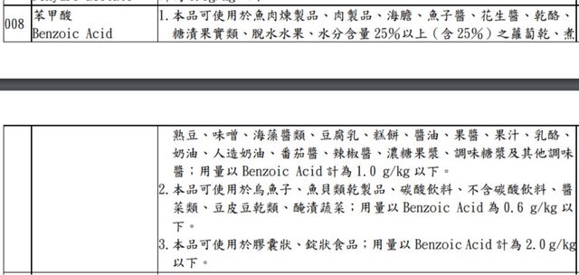 原文43 手機排版 簡單查一下這個防腐劑「苯甲酸 Benzoic Acid」,在「食品添加物使用範圍及限量暨規格 標準」的附件一可以看到下圖 https://i.imgur.com/tUFD233.jpg