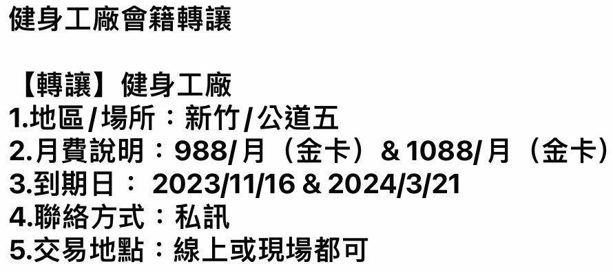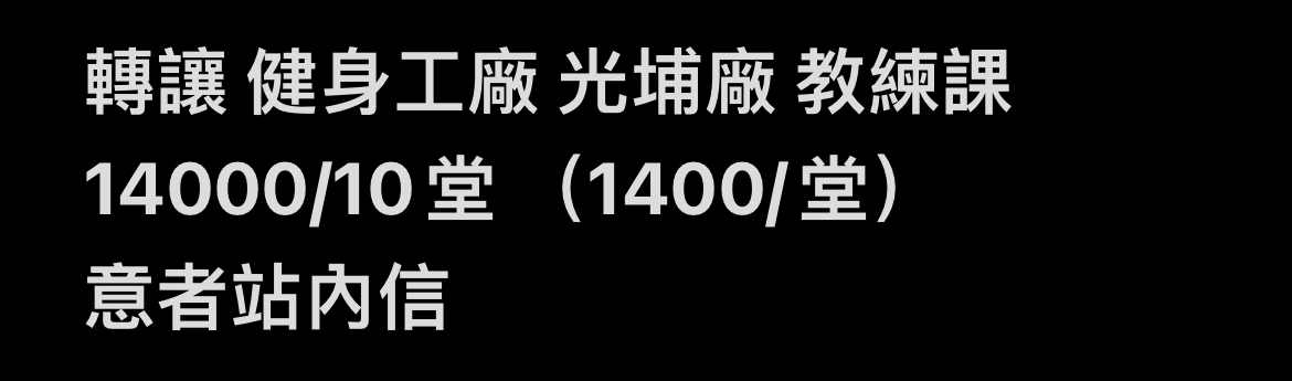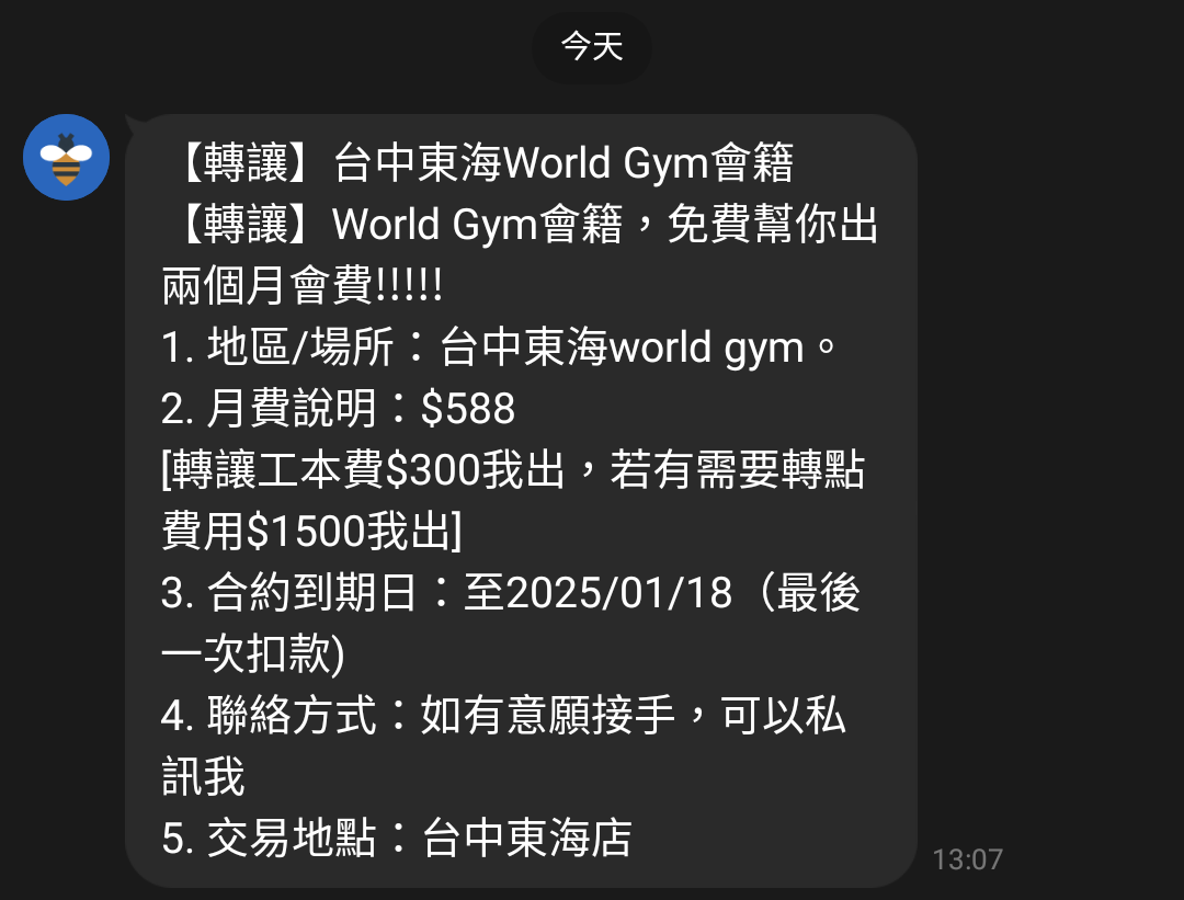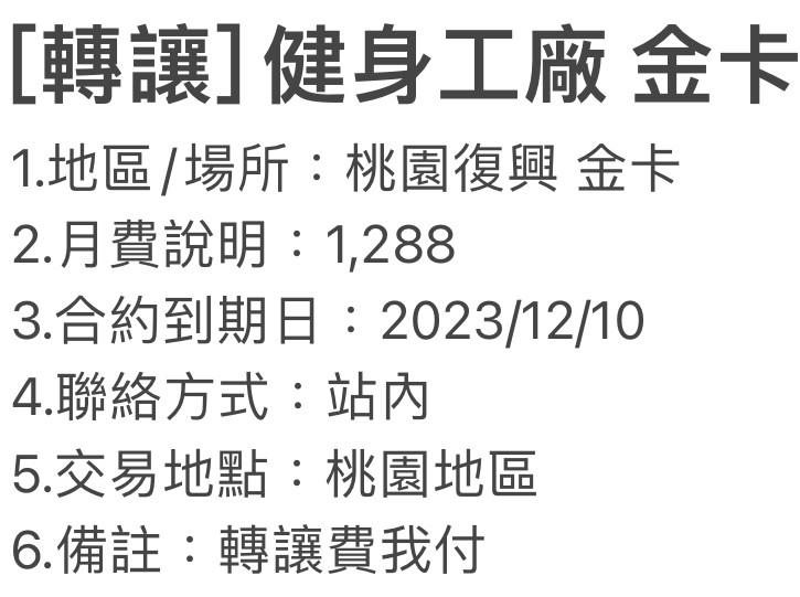 → zxc82922: 徵 台中健身工廠 金卡988 需可轉廠或是逢甲廠 06/16 10:50