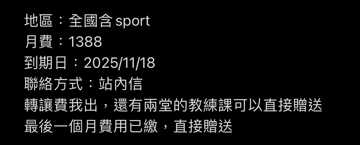 → Tshun: 轉讓 WG 北區sport 月費1488 2023/11/22約滿 站內信 06/21 15:05