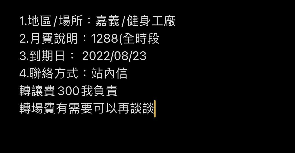 → wei0913: 另外優惠:接收轉讓後我會繳該月份月費,且最後一個月已 05/07 21:15