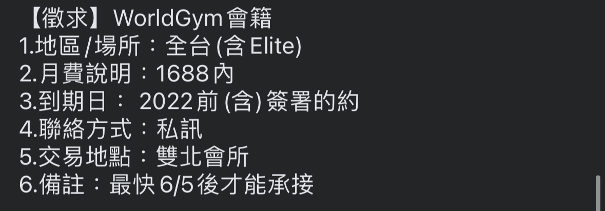→ jkevin2500: [徵]WG(全台 含101 Elite) 2022前(含)簽的會籍合約 05/03 20:39