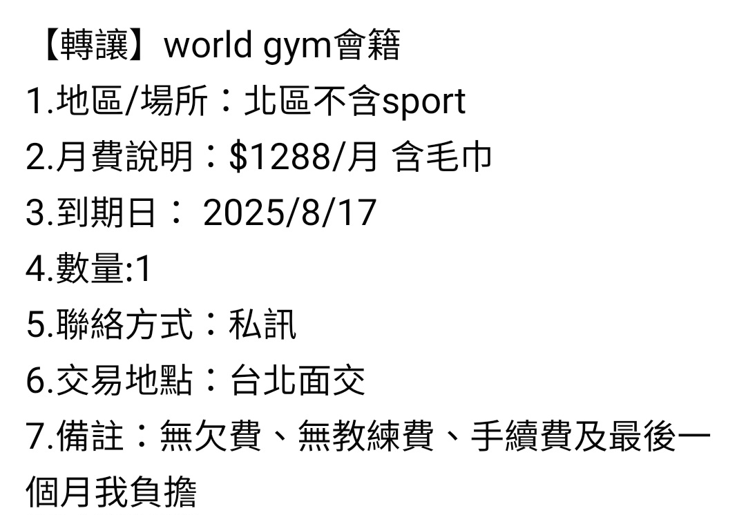 → ydaykimo: 【轉讓】world gym 港墘 1088含毛巾 到2024/11/25 05/08 18:00