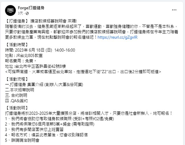 看到打鐵健身正在徵人