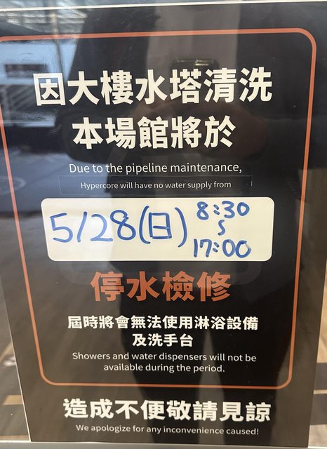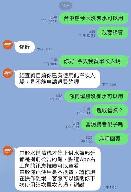 對 超核心下午一點左右還沒有工作人員在場 只有一個警衛阿伯 遇到突發事情只能跟客服溝通 還不給退費 屎越來越急 再爭論下去就要拉出來了 只好先離場 改天要進場還要先跟客服聯絡= = 最後他們的停水通知藏在這裡 https://i.imgur.com/sNNuGEt.jpg