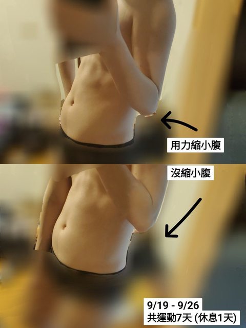 : 不確定各位巨巨們看到我腹部照片的感想如何,我自己還是很受不了這個下腹,是否需要改善運動方式或飲食量來讓下腹更有成效呢?