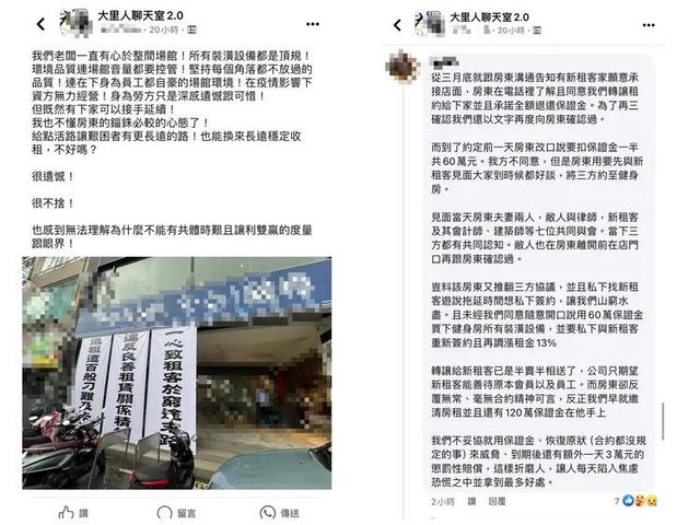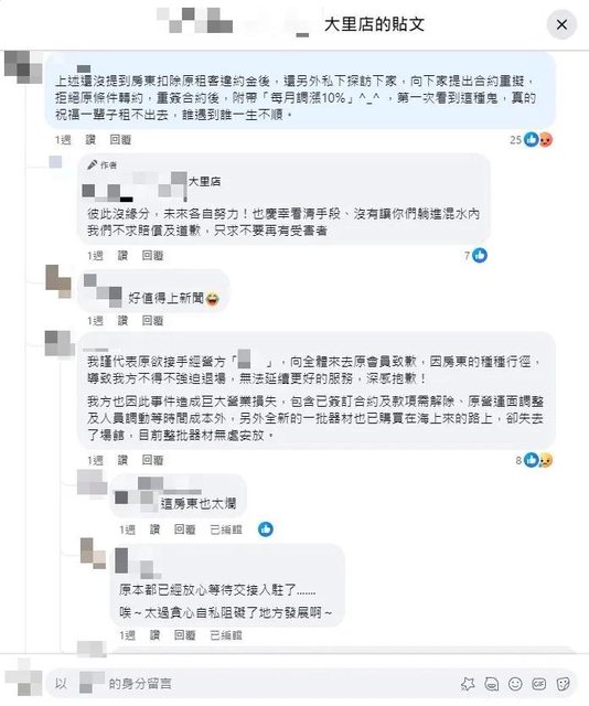 原欲接手之新經營方也現身留言,抖出房東惡意行徑。翻攝《大里人聊天室2.0》臉書
