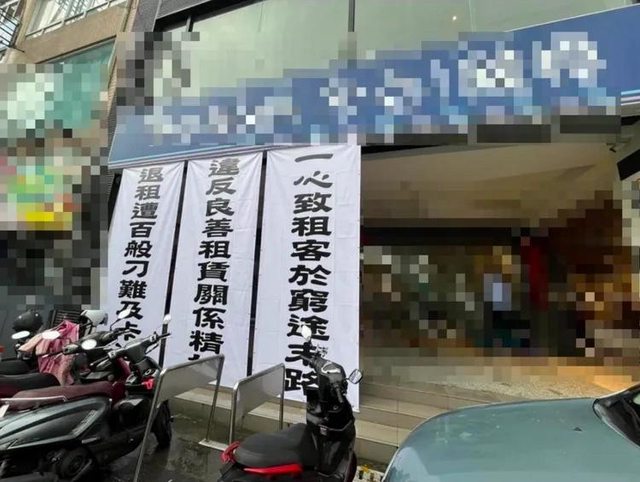 著三大面白布條,疑似業者退租時遭受房東百般刁難,最終只好以此手段發出抗議之聲,