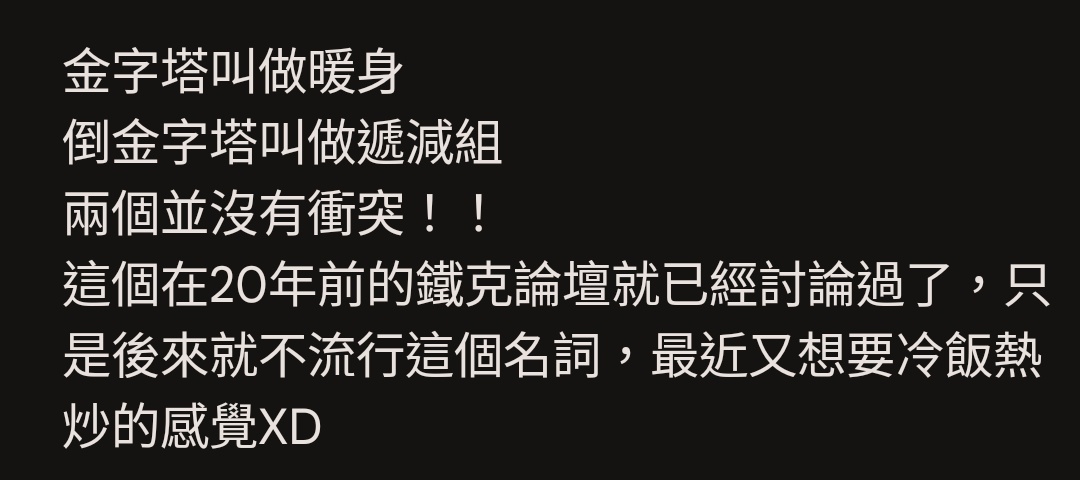 推 wen12305: 倒金字塔一樣可以做暖身啊,又不是一開始就正式組06/18 19:44