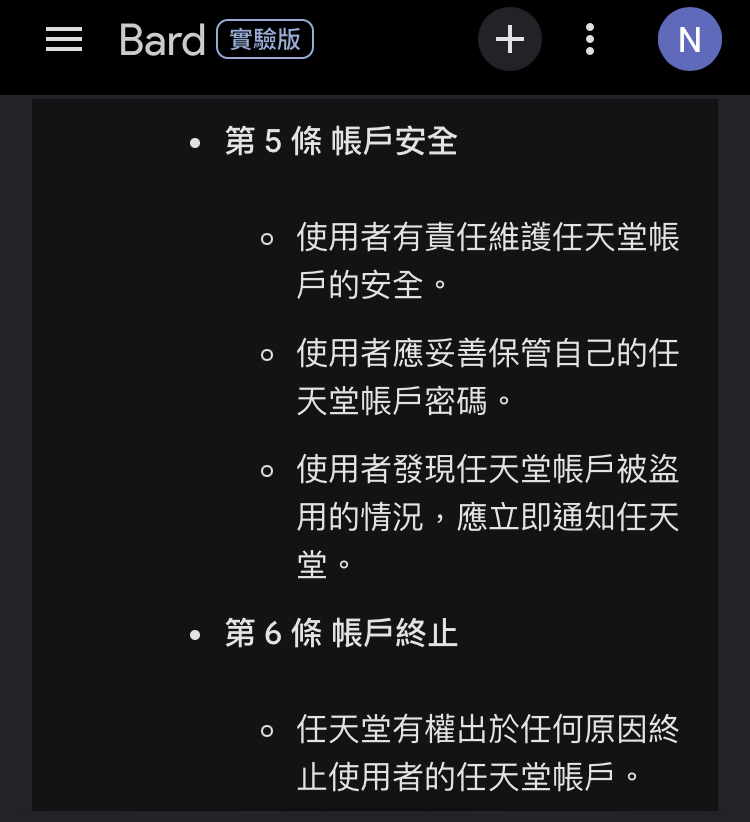 → Ohgogogo: 剛請Bard幫我摘要任天堂日文官方的使用條款,看到關鍵字 10/09 22:07