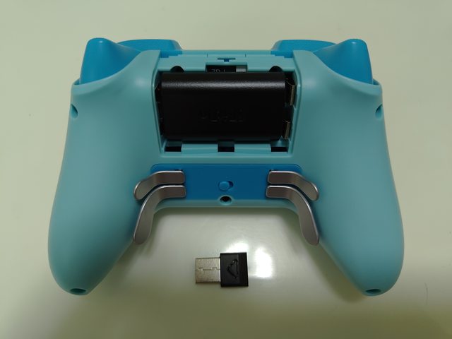 以及背面,這邊就看的到購買主因的乾電池設計,還有主打的XBOX菁英同設計四顆背鍵