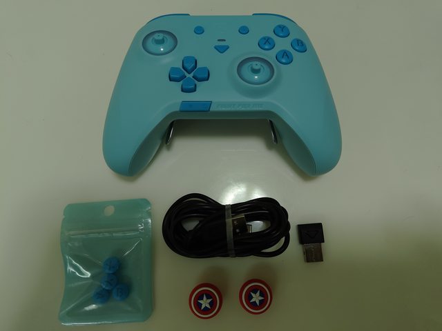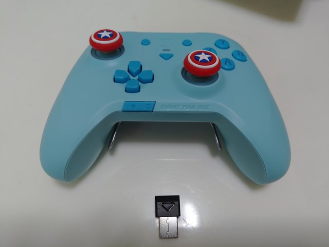 裝上搖桿帽的正面,這邊接收器拍的比較明顯,那個三角型是能按下去的配對按鍵