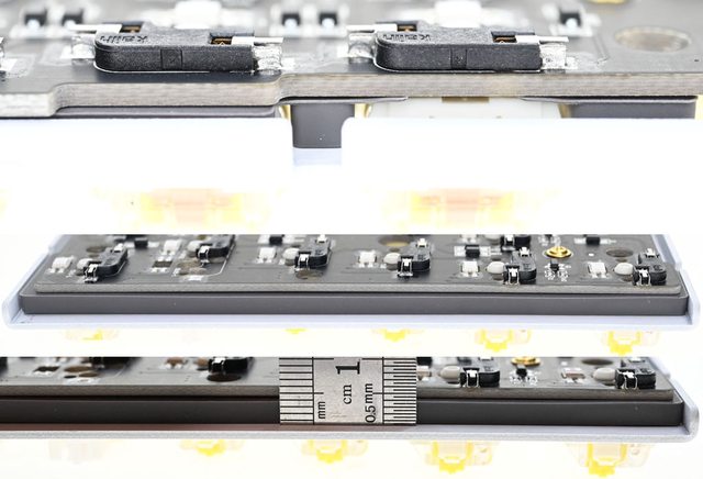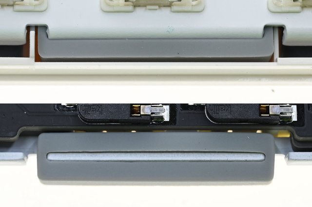 ▼鍵軸固定金屬板與主電路板之間也有灰色矽膠材質防震吸音墊,厚度接近4mm