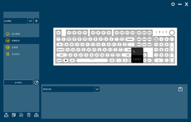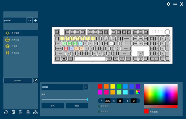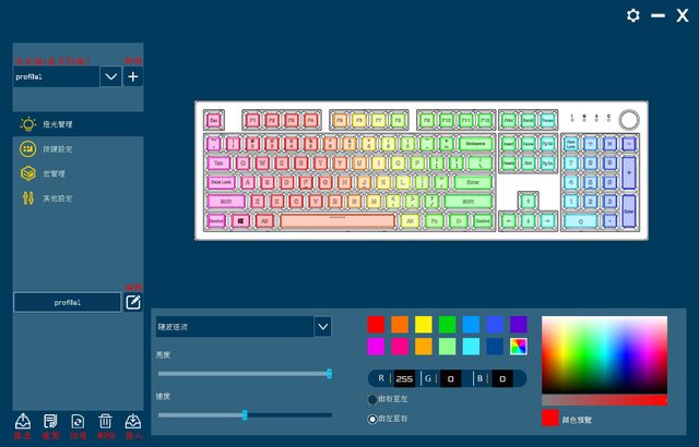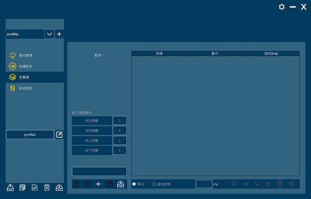 ▼應用程式畫面,左上可選擇/新增設定檔,左中可切換燈光管理/按鍵設定/宏管理/其他