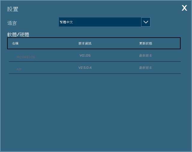 ▼按下程式頁面右上齒輪圖示可進入設置選單,可設定語言及顯示軟體/硬體的版本資訊