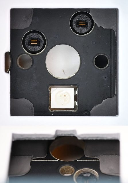 ▼鍵軸熱插拔座相容5腳MX軸,下方6點鐘方向有RGB LED,中間大孔及左右小孔為固定銷